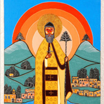 يحمل بيده اليمنى الصليب الماروني ذا الشعب الثلاث وبيارك به...