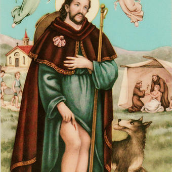 ولد في اواخر القرن الثالث عشر في مدينة مونبلييه في فرنسا من ابوين شريفين تقيين. وعند ولادته ظهر على صدره صليب احمر، رمزاً لجهاده في الحياة حتى الدم. وكان متفانياً بوجه خاص في محبة القريب. ولما توفي والداه، وهو ابن عشرين سنة، وزع امواله على الفقراء، تاركاً لعمه ما يملكه من اراضٍ واسعة وقرى عديدة. ثم تنكر بزي الفقراء والمساكين وهجر وطنه قاصداً الى مدينة روما العظمى. وما دخل ايطاليا حتى رأى مرض الطاعون يفتك في اكثر مدنها. فشرع يهتم في دفن الموتى ويخدم المرضى ويشفيهم باشارة الصليب المقدس. غير ان اصيب هو نفسه بهذا المرض ولازمه وجع مؤلم في جنبه فأوى الى غاب خارج المدينة، وهناك قاسى آلاماً مبرحة.